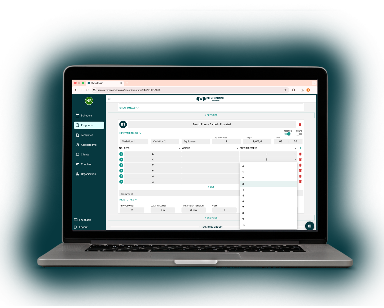 Easily build progression within a single program by adjusting reps, RPE, or RIR week to week. CleverCoach gives coaches finer control over how training is prescribed, without rebuilding workouts or programs.